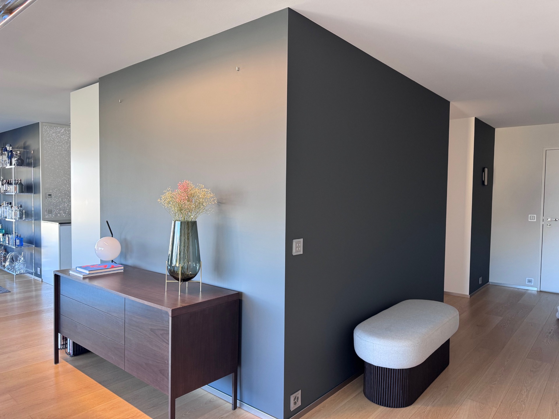 Fassadenrenovation: Abrieb mit Kaltwasser-Hochdruck gereinigt, Untergrund sorgfältig vorbereitet und den Abrieb zweimal mit Fassadenfarbe gestrichen. Untersicht geschliffen, gereinigt und mit einem Grund-, Zwischen- und Schlussanstrich mit Wetterschutzfarbe gestrichen. Eingangstüre geschliffen, gespachtelt, grundiert und zweimal mit Kunstharz-Finish lackiert.